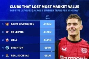 夏窗后球队身价跌幅榜:勒沃库森下跌2.53亿欧,莱比锡1.7亿第二